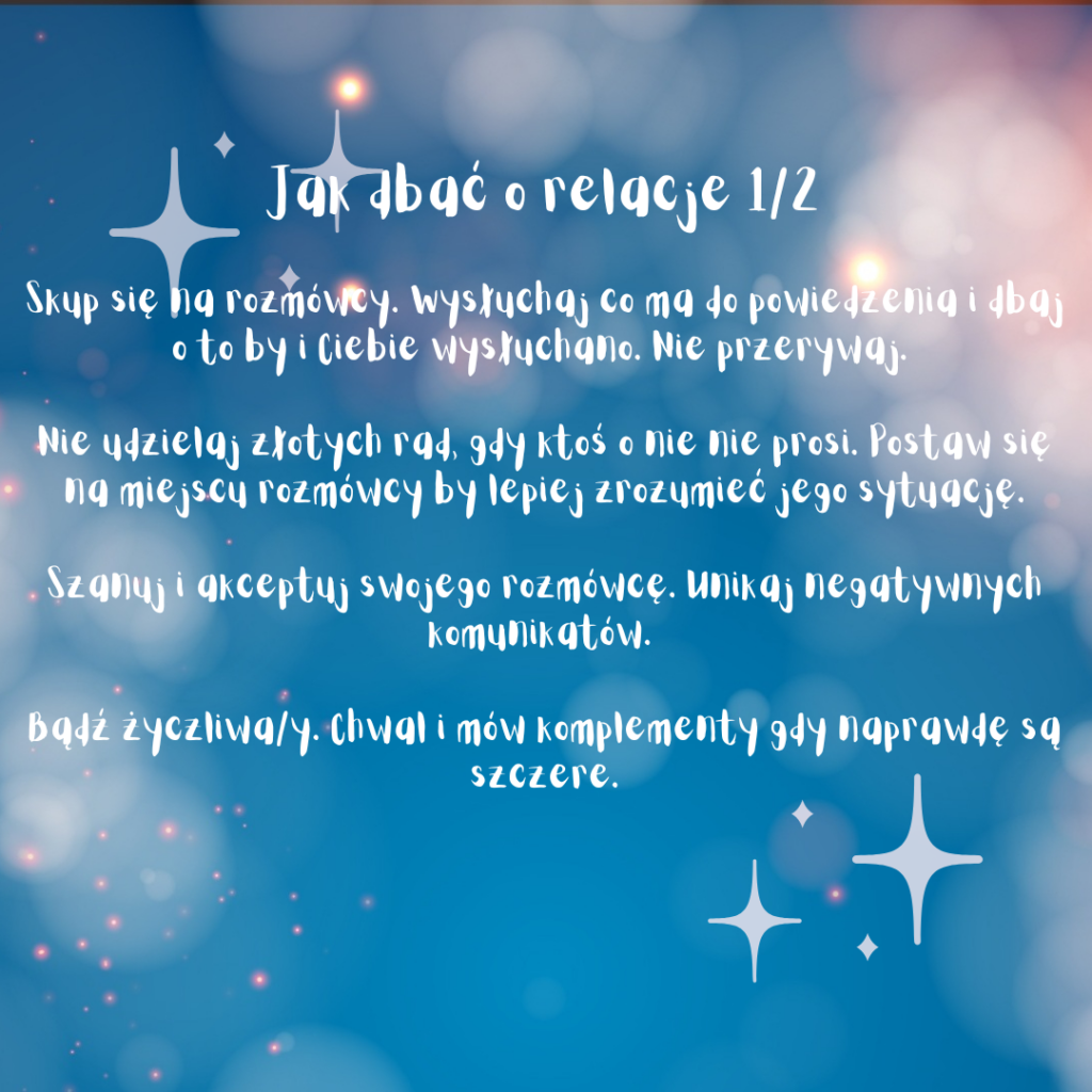 Relacje – kolejny naprawdę ważny element naszego życia, od którego jakości ono zależy. Warto postarać się, by obszar ten dawał nam radość i satysfakcję. Daj znać w komentarzu jak się mają Twoje relacje i co robisz by o nie dbać.