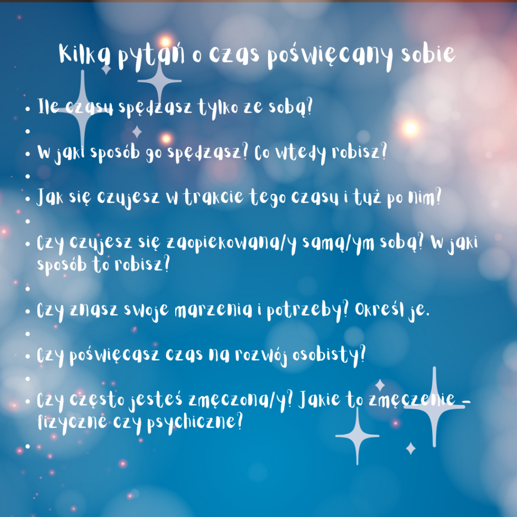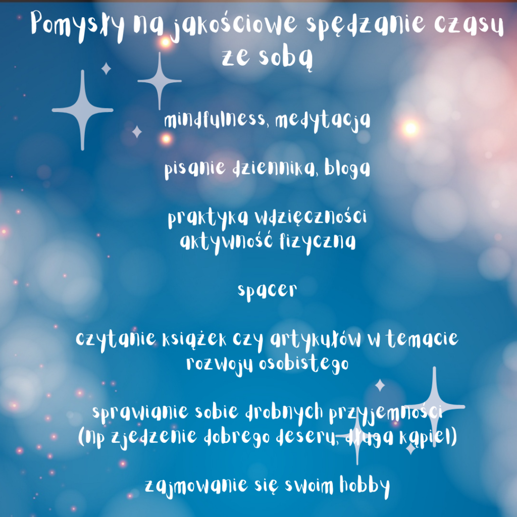 📚Spędzanie jakościowego czasu ze sobą jest niezwykle ważne dla naszego zdrowia psychicznego. Nie jesteśmy maszynami bezmyślnie wykonującymi zadania, potrzebujemy zatroszczyć się o siebie. Będąc w ciągłym trybie zadaniowym łatwo jest zepchnąć siebie na koniec listy obowiązków, jednak wiąże się to z szeregiem negatywnych skutków.